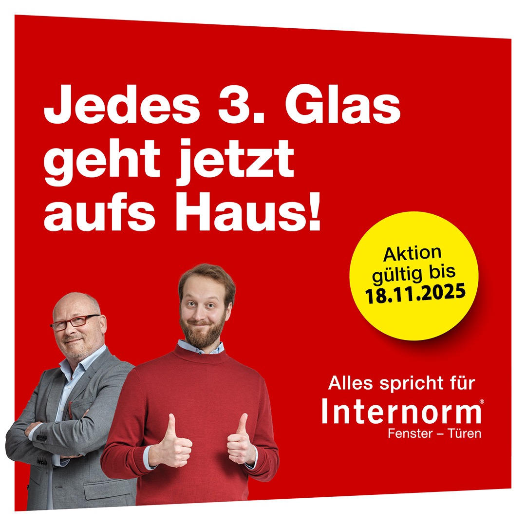 Holen Sie sich bis zum 18.11.2025 bei allen Internorm-Fenstern das 3. Glas gratis und ausgewählte Haustüren zum sensationellen Aktionspreis.